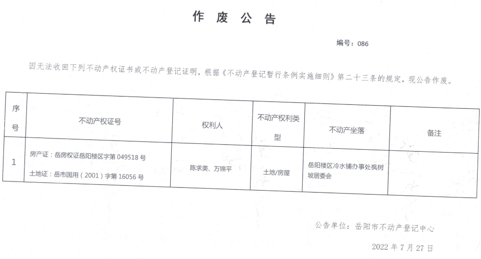 作废公告 编号:086(陈求美、万锦平)