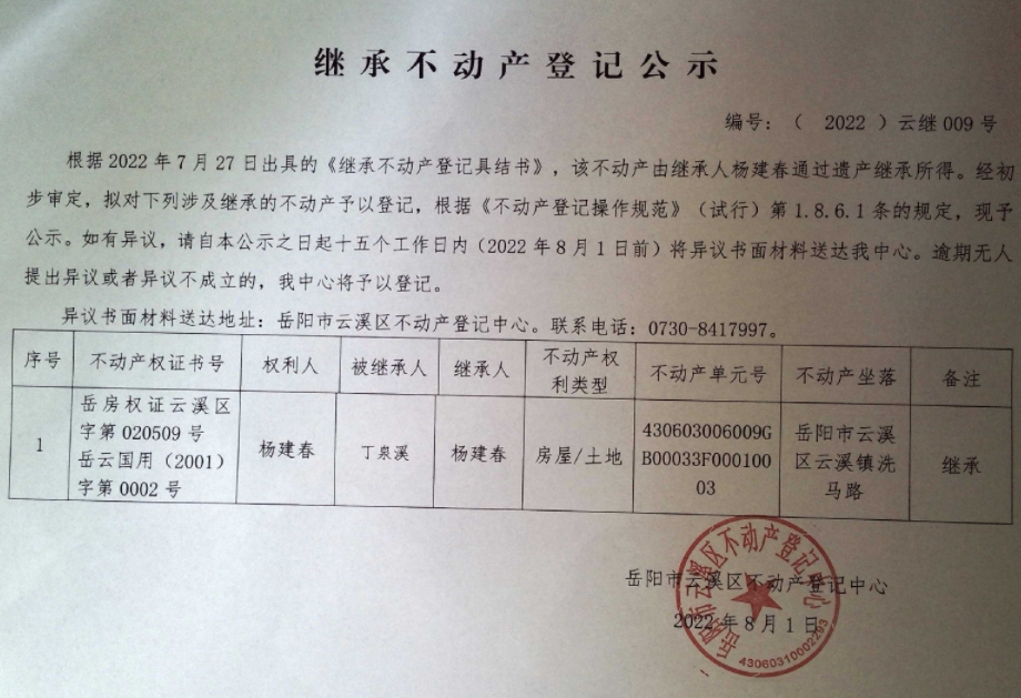 继承不动产登记公示 编号:(2022)云继009号