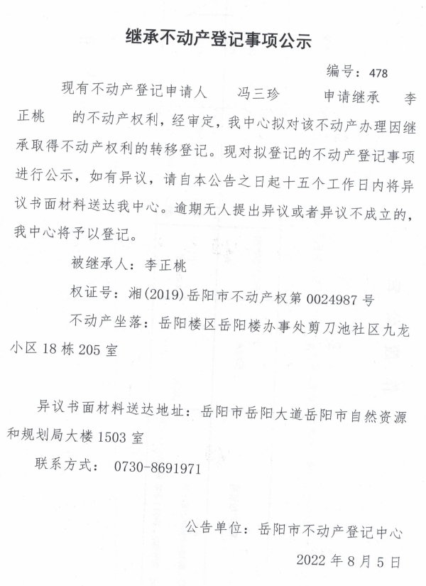 继承不动产登记公示 编号:冯三珍