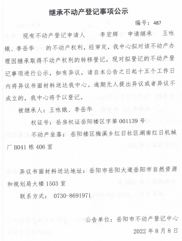 继承不动产登记公示 编号:李宏辉