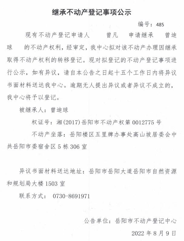 继承不动产登记公示 编号:曾凡