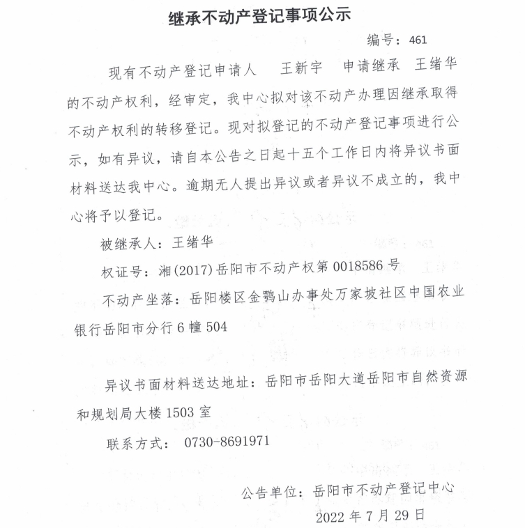 继承不动产登记事项公示 编号:461(王新宇)