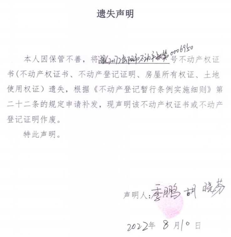 遗失声明(季鹏、胡晓芬)