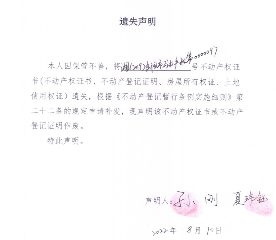 遗失声明(孙刚、夏玮钰)