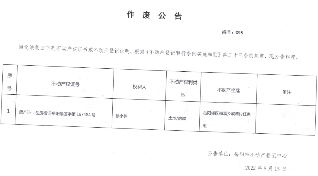 作废公告 编号:096(徐小英)