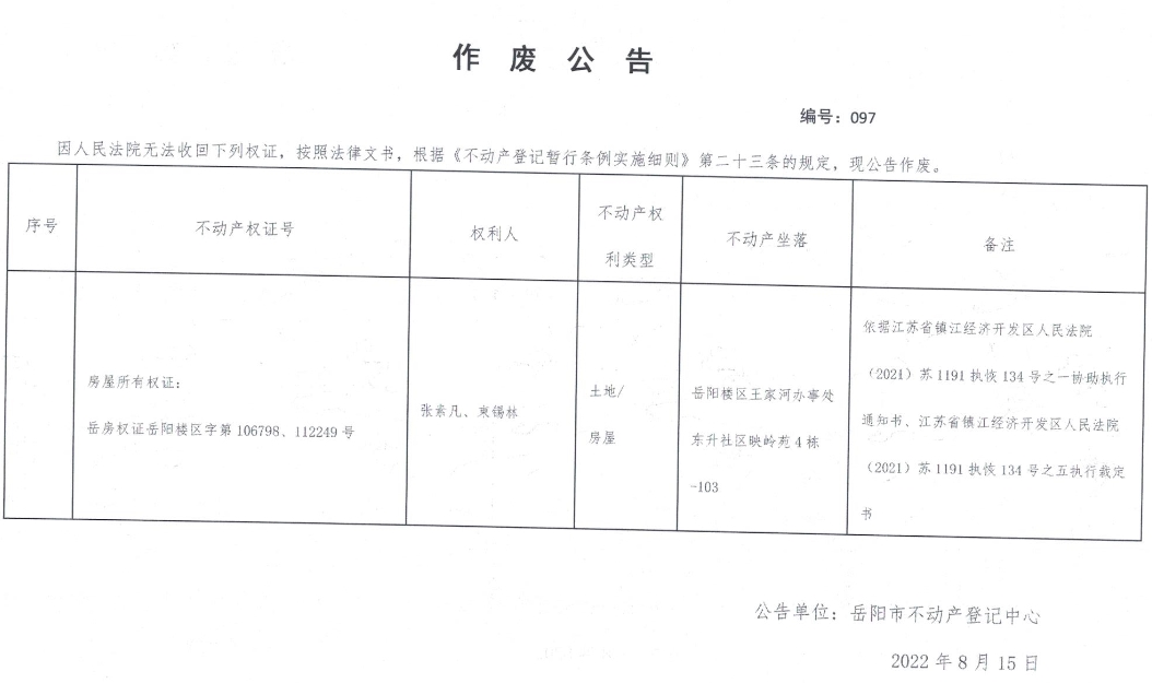 作废公告 编号:097(张素凡、束锡林)