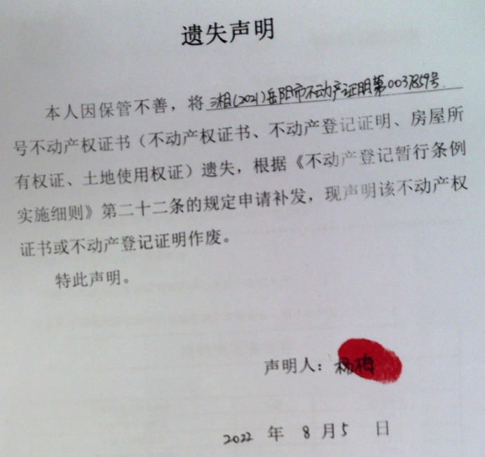 遗失声明(抵押权人中国建设银行股份有限公司岳阳市分行;抵押义务人杨梅)