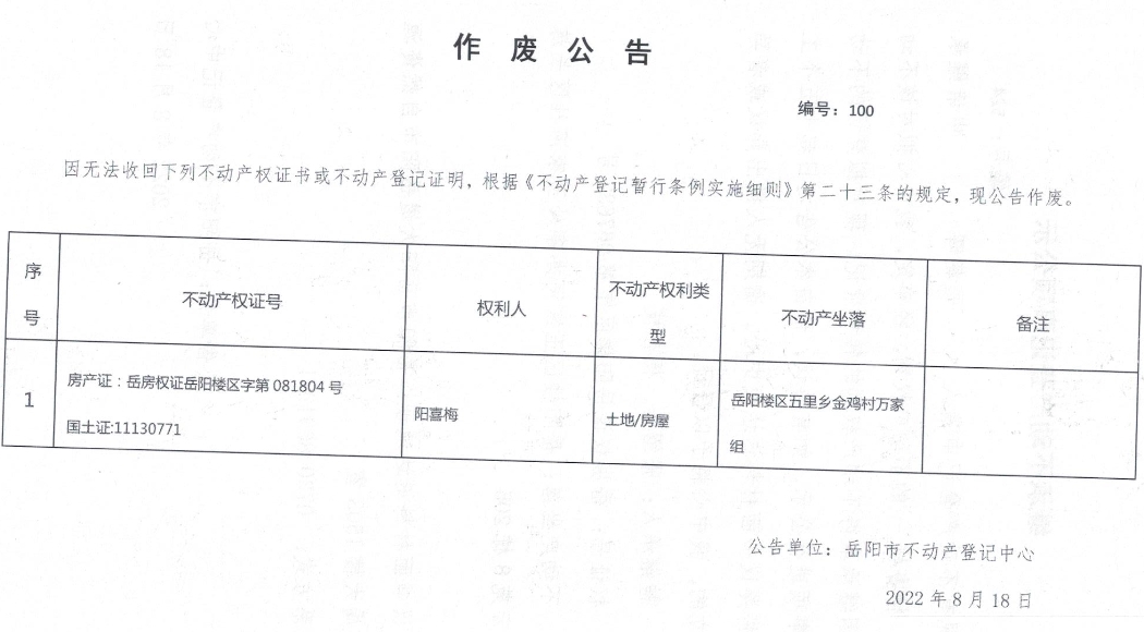 作废公告 编号:100(阳喜梅 )