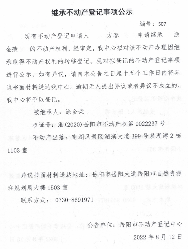 继承不动产登记公示 编号:方春