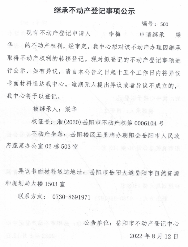 继承不动产登记公示 编号:李梅