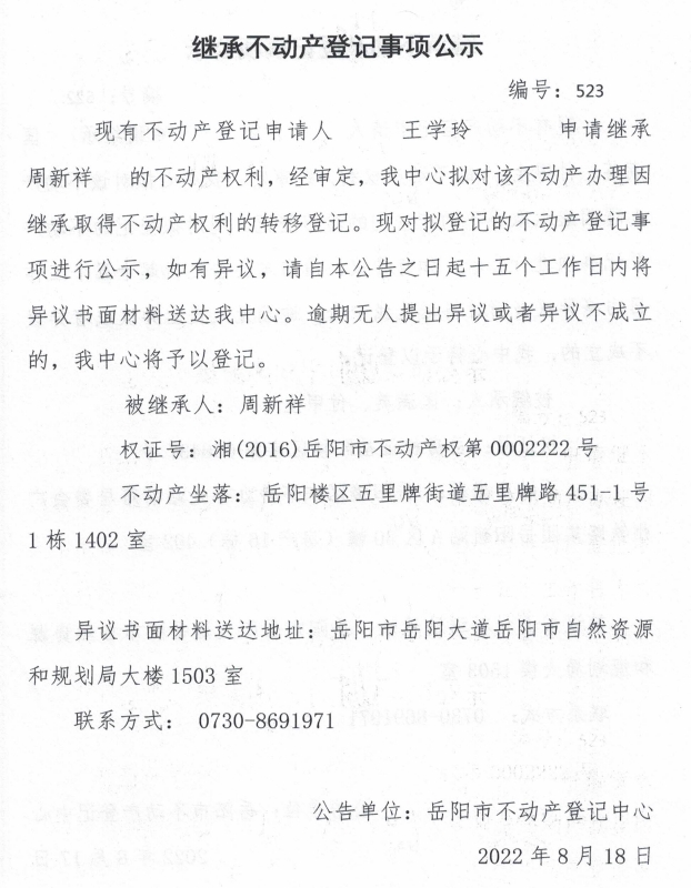 继承不动产登记公示 编号:王学龄