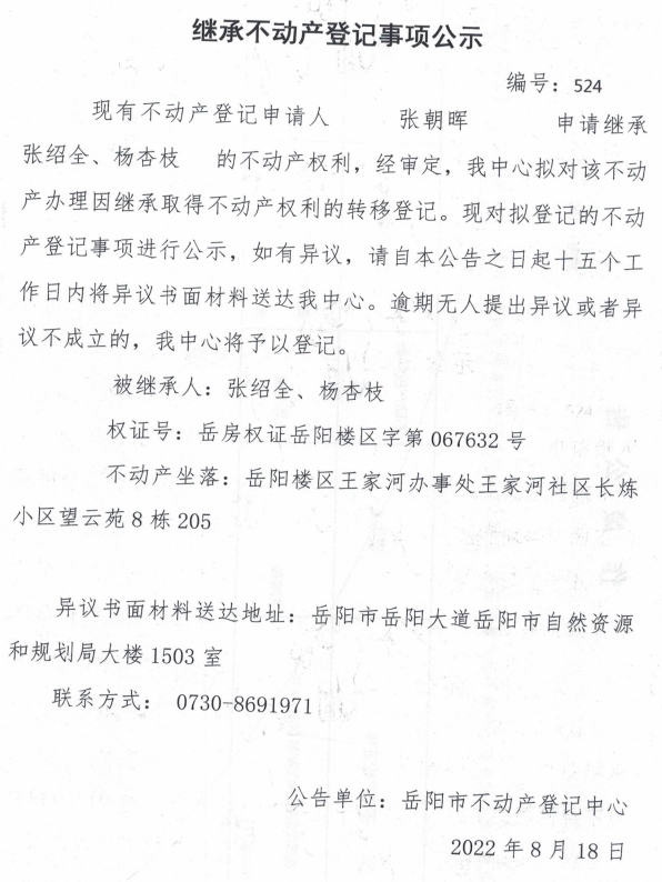 继承不动产登记公示 编号:张朝晖