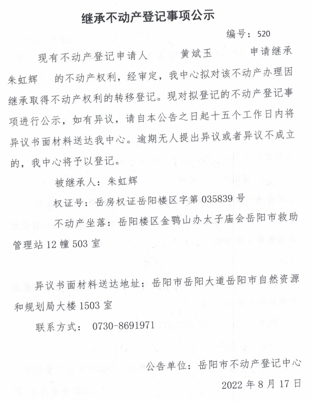 继承不动产登记公示 编号:黄斌玉