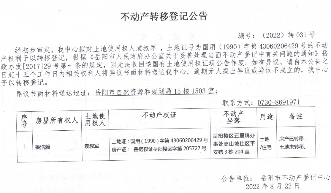 不动产转移登记公告 编号:031(袁叔军)