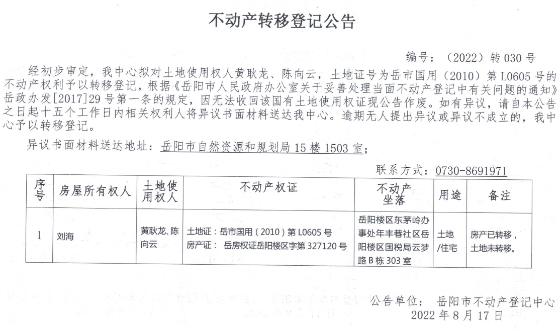 不动产转移登记公告 编号:030号(黄耿龙、陈向云)