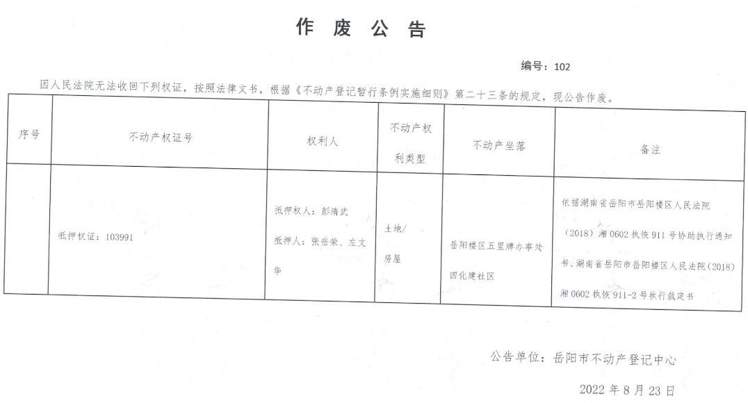 作废公告 编号:102(抵押权人彭清武;抵押人张岳荣、左文华)