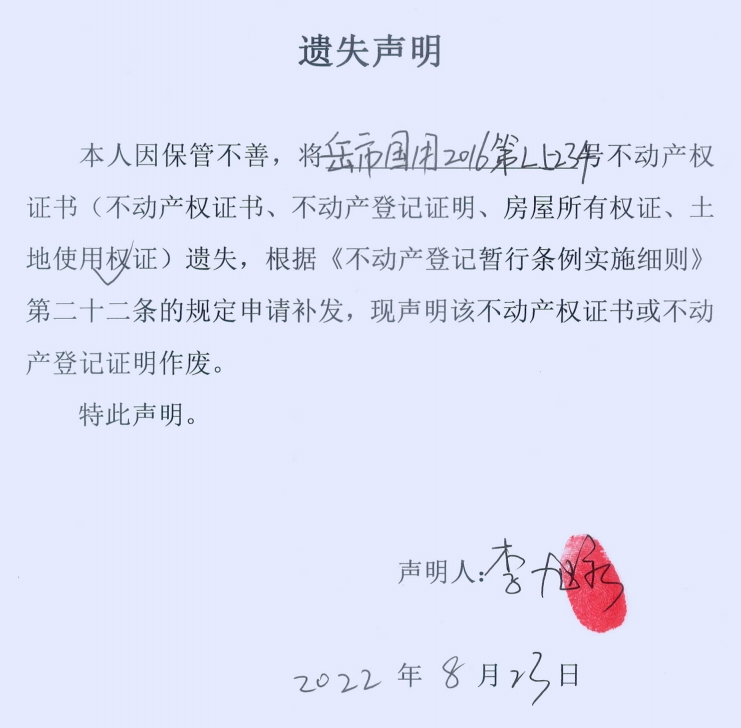 遗失声明(李旭初、杨藕花)