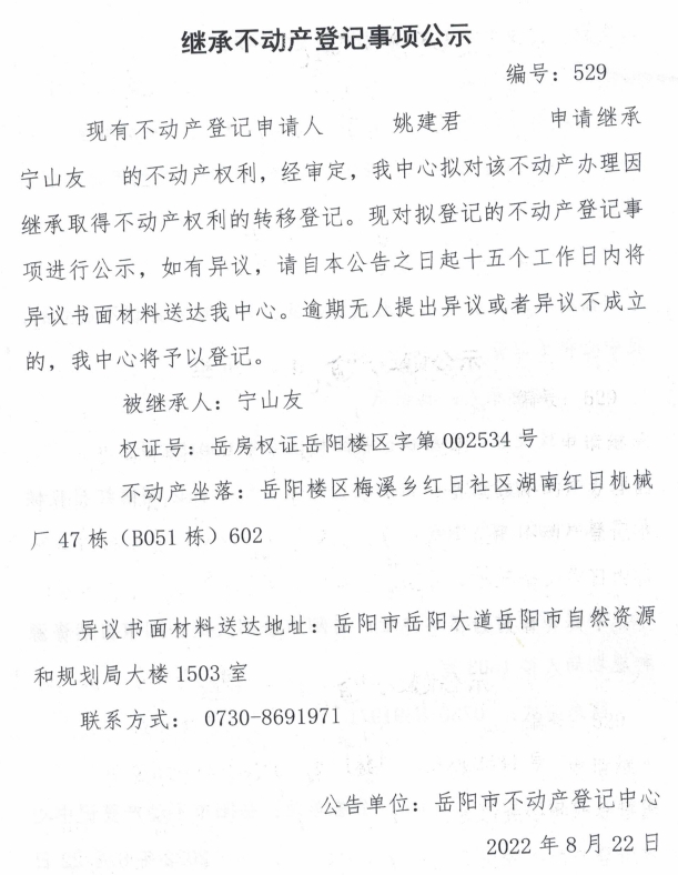 继承不动产登记公示 编号:姚建君