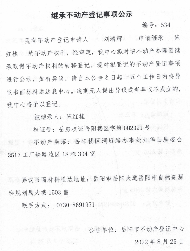 继承不动产登记公示 编号:刘清辉