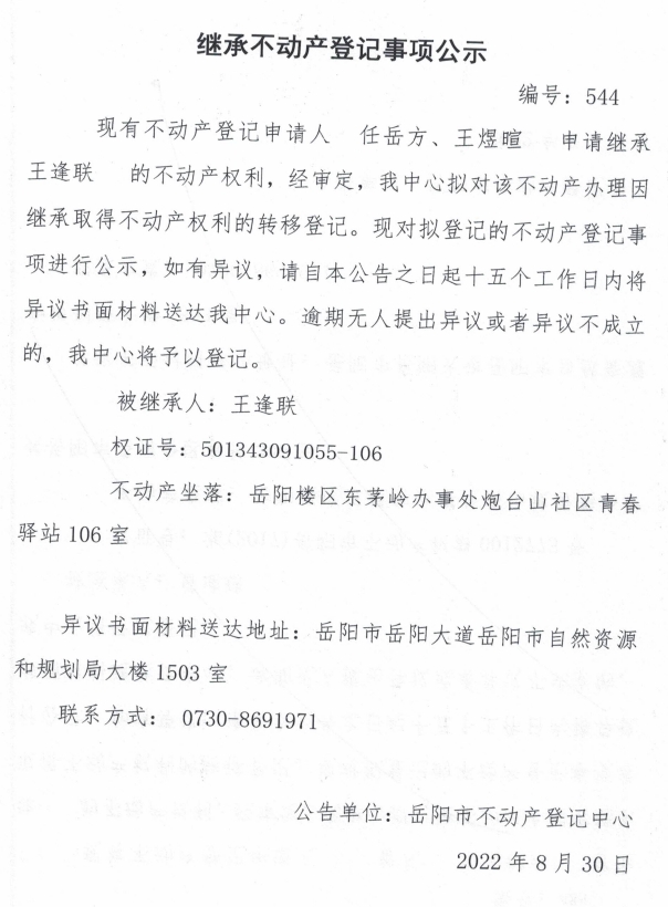 继承不动产登记公示 编号:任岳方