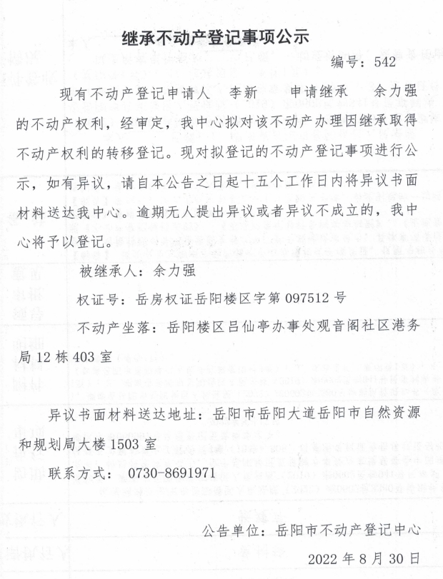 继承不动产登记公示 编号:李新