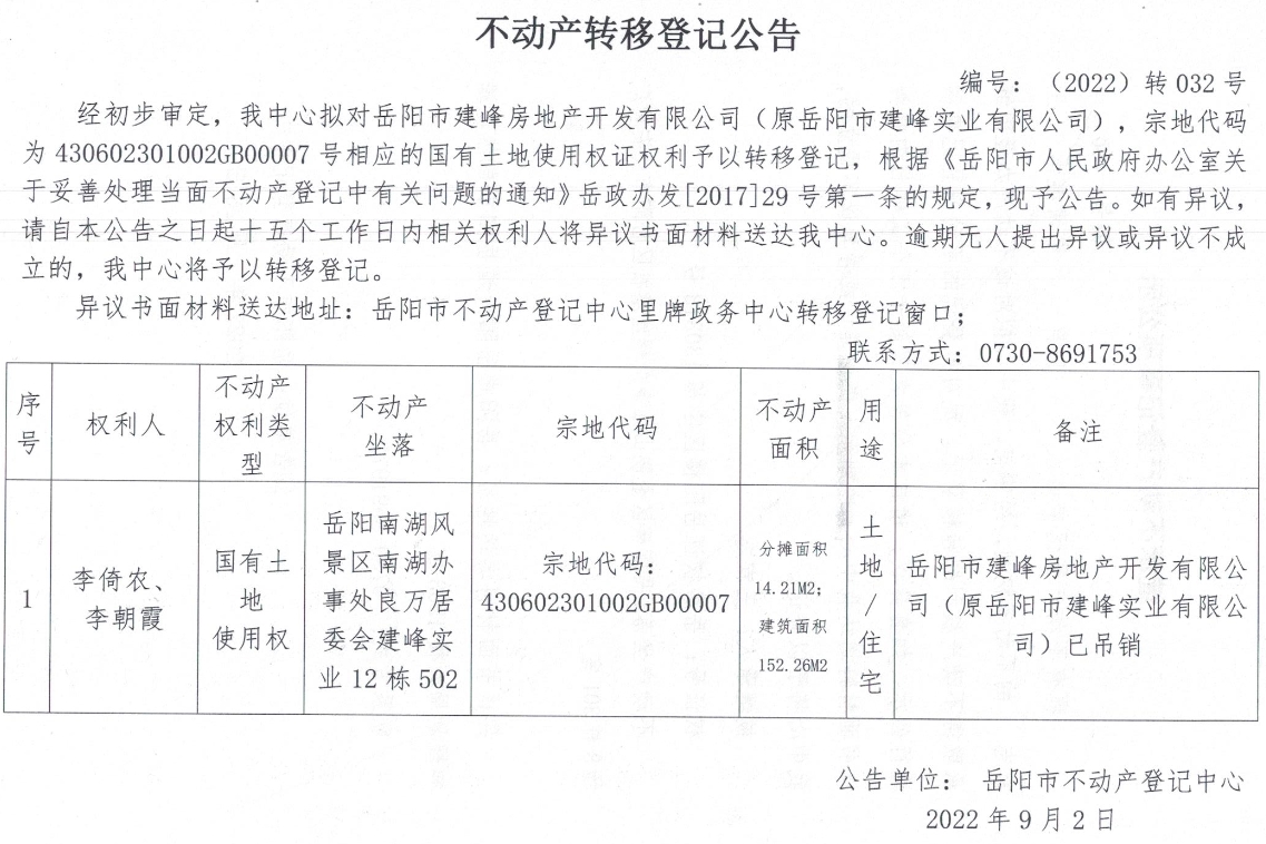 不动产转移登记公告 编号:转032(岳阳市建峰房地产开发有限公司(原岳阳市建峰实业有限公司))