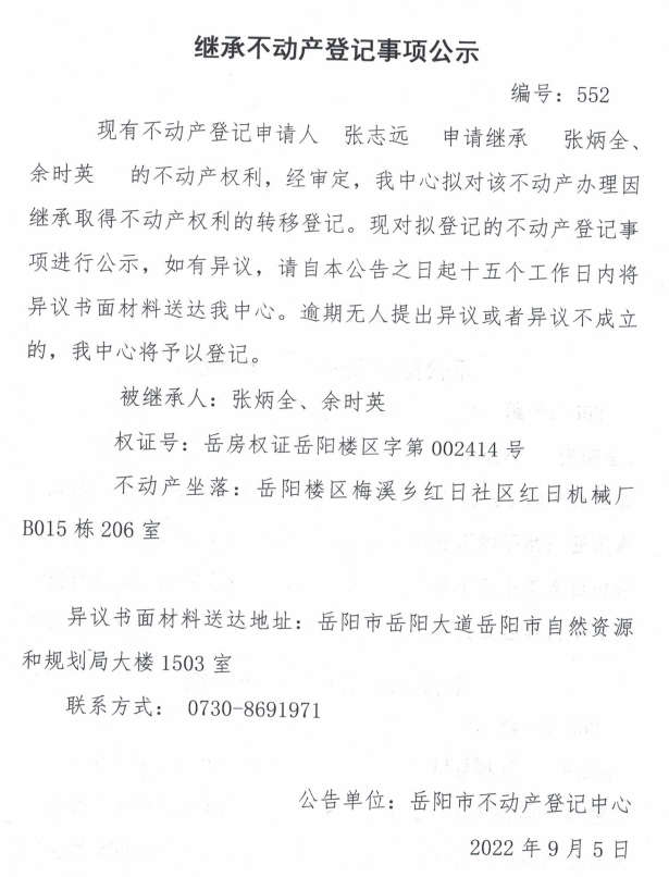 继承不动产登记公示 编号:张志远
