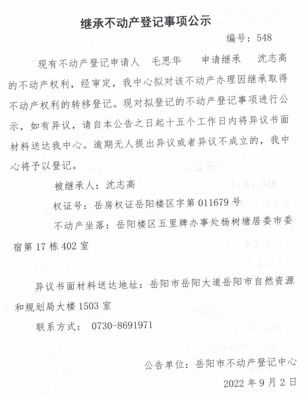 继承不动产登记公示 编号:毛思华