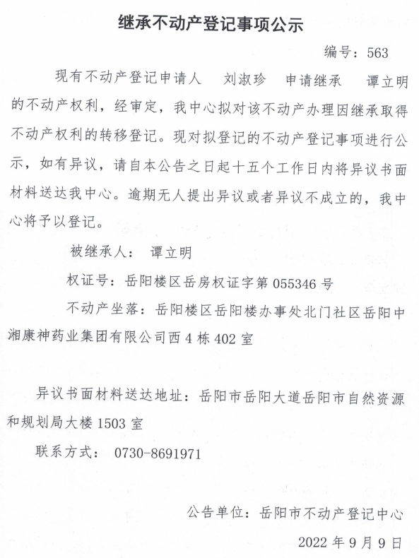 继承不动产登记公示 编号:刘淑珍