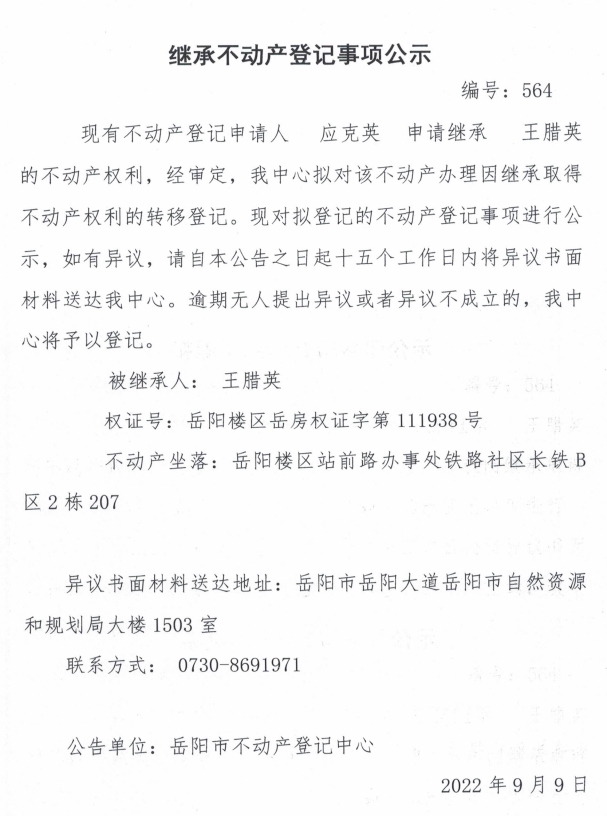 继承不动产登记公示 编号:应克英