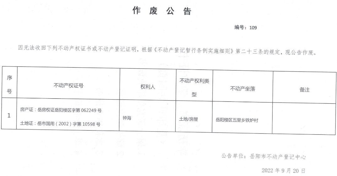 作废公告 编号:109(钟海)