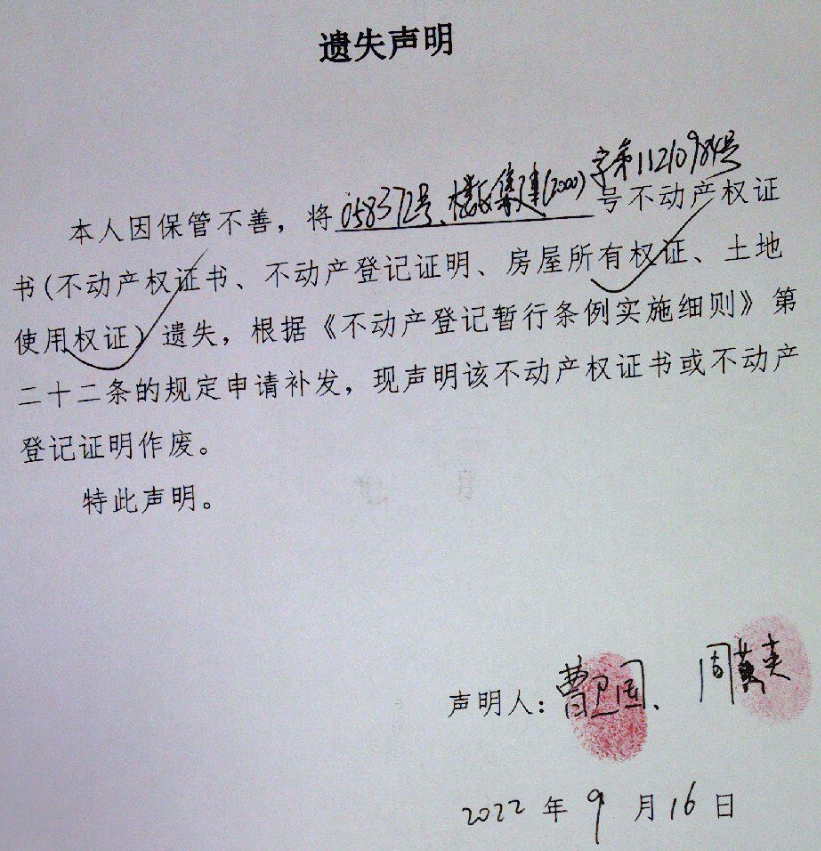 遗失声明(曹卫国、周黄英)