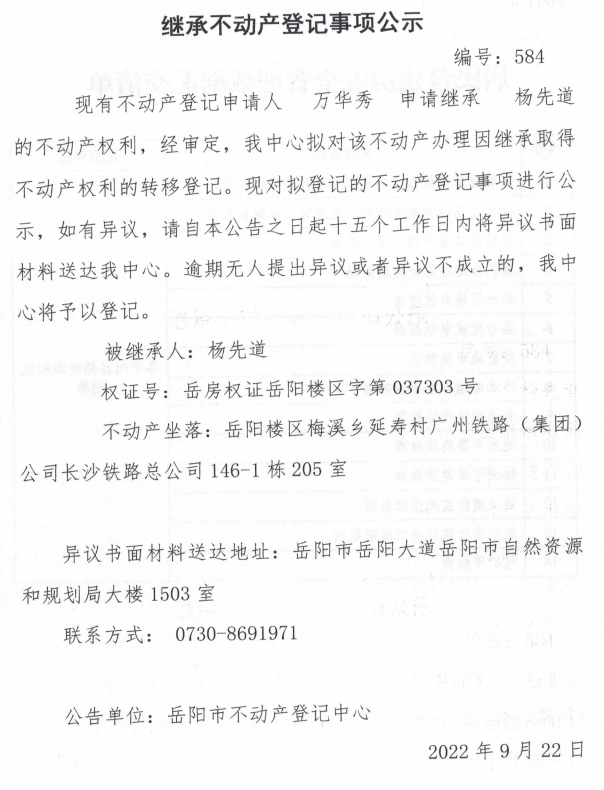 继承不动产登记公示 编号:万华秀