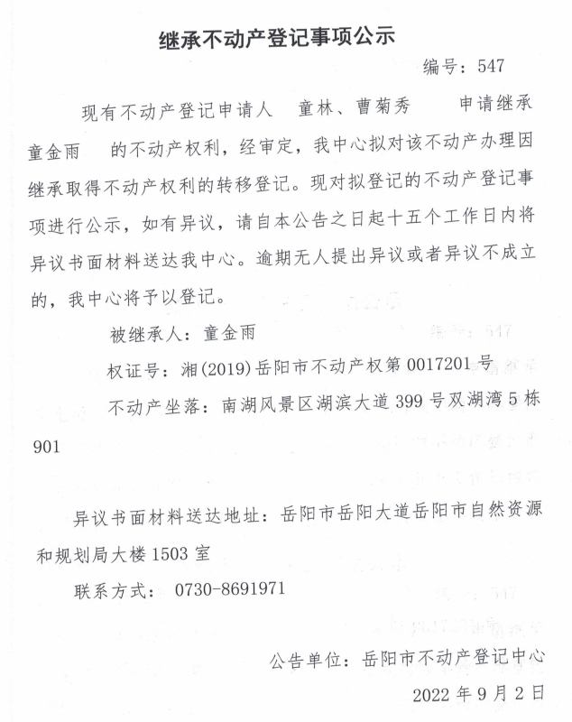 继承不动产登记公示 编号:童林