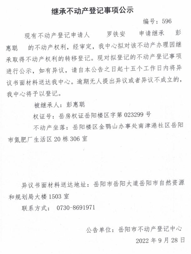 继承不动产登记公示 编号:罗铁安