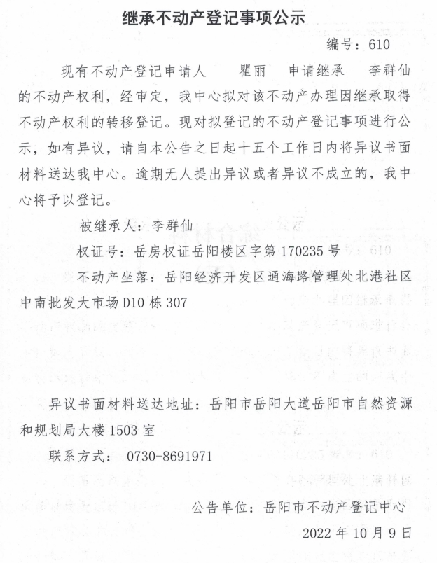 继承不动产登记公示 编号:瞿丽