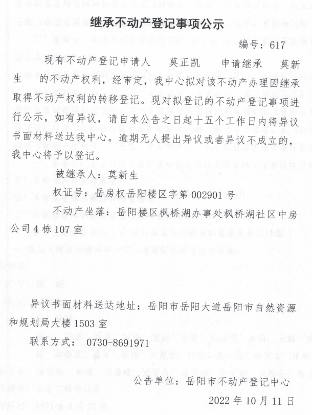 继承不动产登记公示 编号:莫正凯(617号)