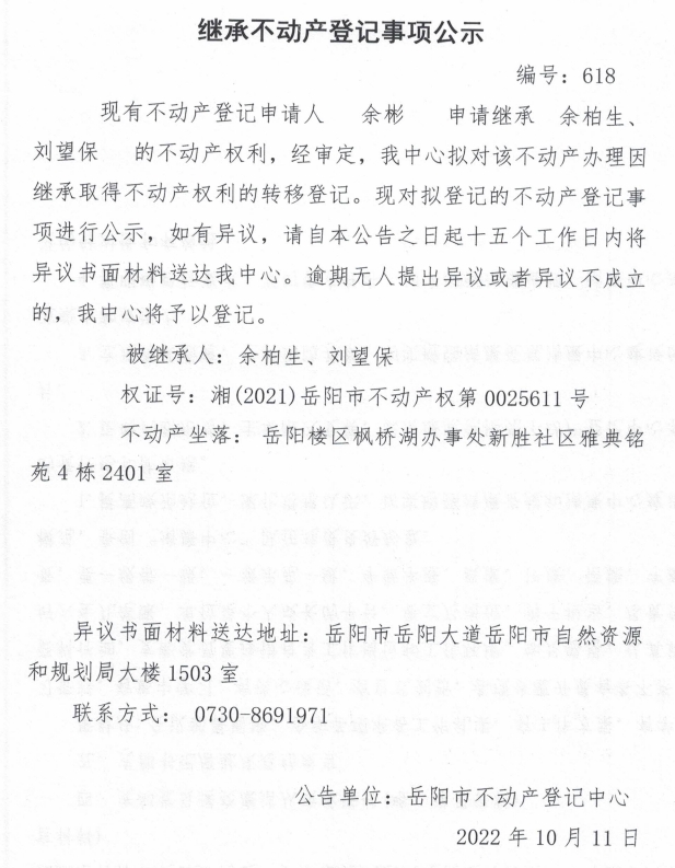 继承不动产登记公示 编号:余彬(618号)