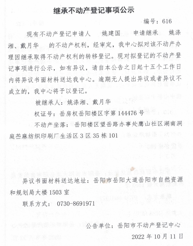 继承不动产登记公示 编号:姚建国(616号)