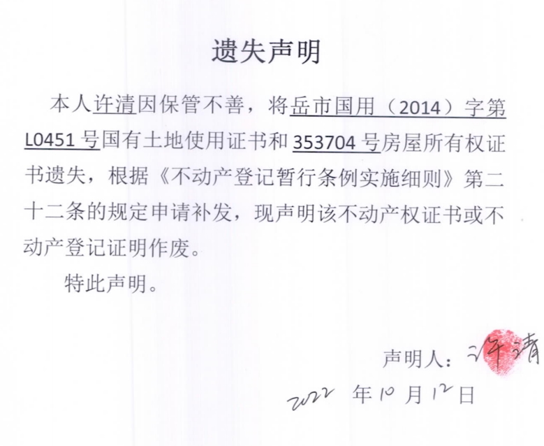 遗失声明(许清)