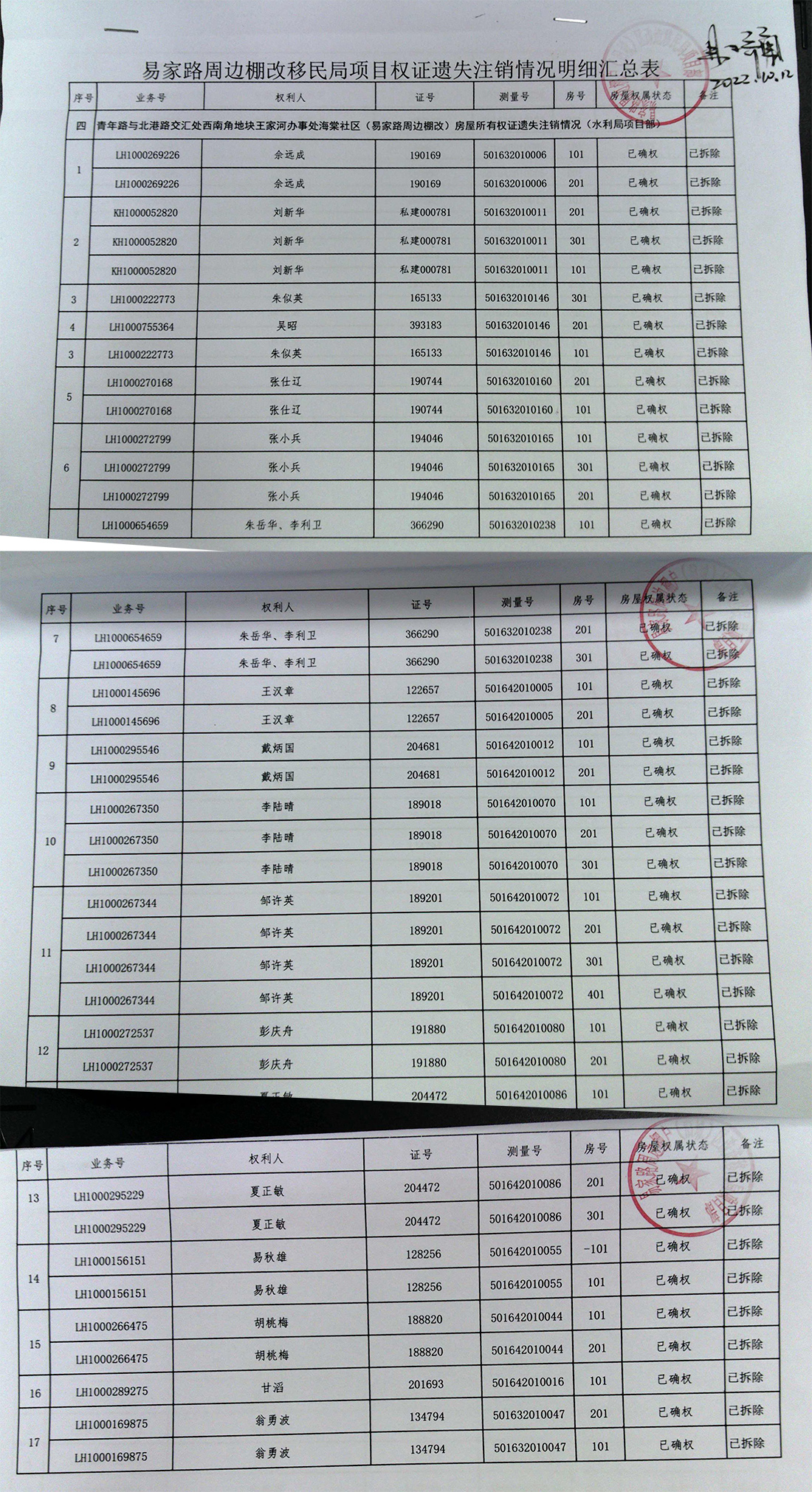 易家路周边棚改移民局项目权证遗失注销情况表(佘远成、刘新华等)