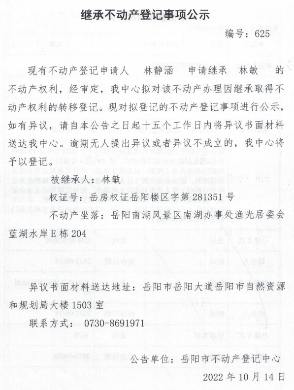 继承不动产登记公示 编号:林静涵(625)