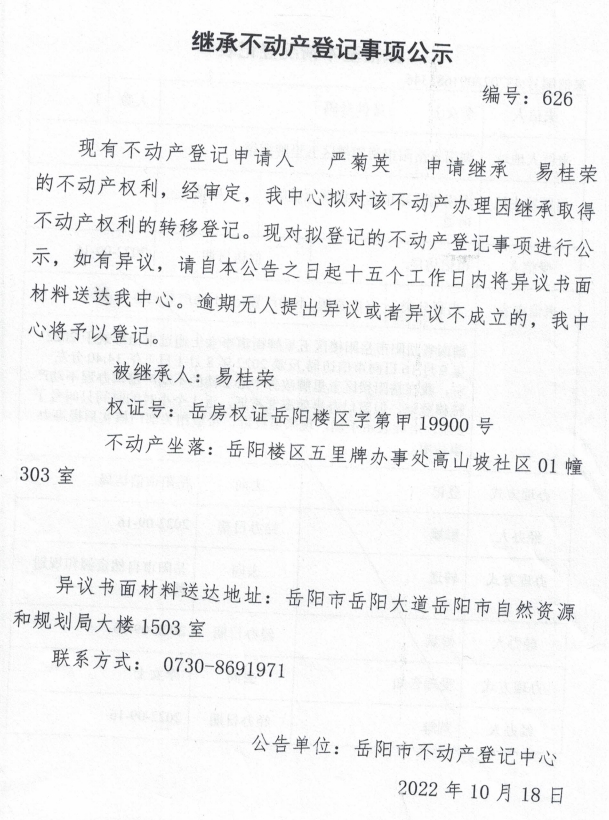 继承不动产登记公示 编号:严菊英(626)