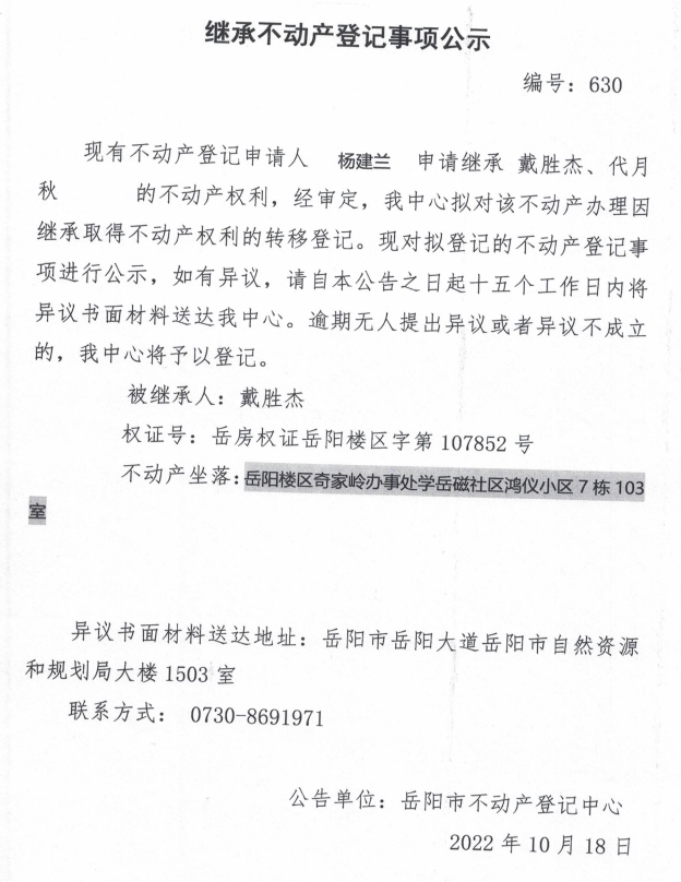 继承不动产登记公示 编号:杨建兰(630)