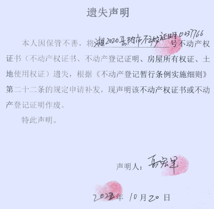 遗失声明( 曾利红、岳宏军 )