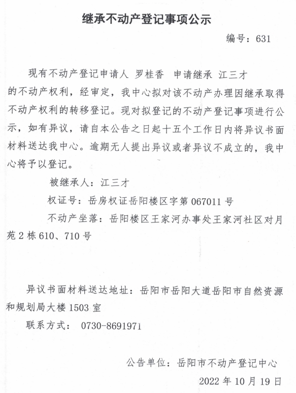 继承不动产登记公示 编号:罗桂香(631)