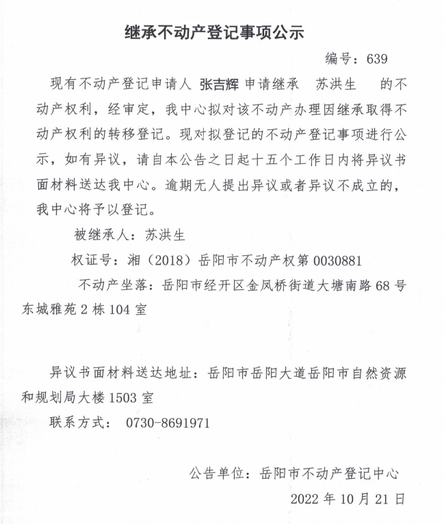 继承不动产登记公示 编号:张吉辉(639)