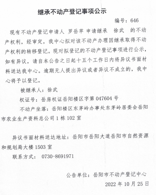 继承不动产登记公示 编号:罗岳苹(646)