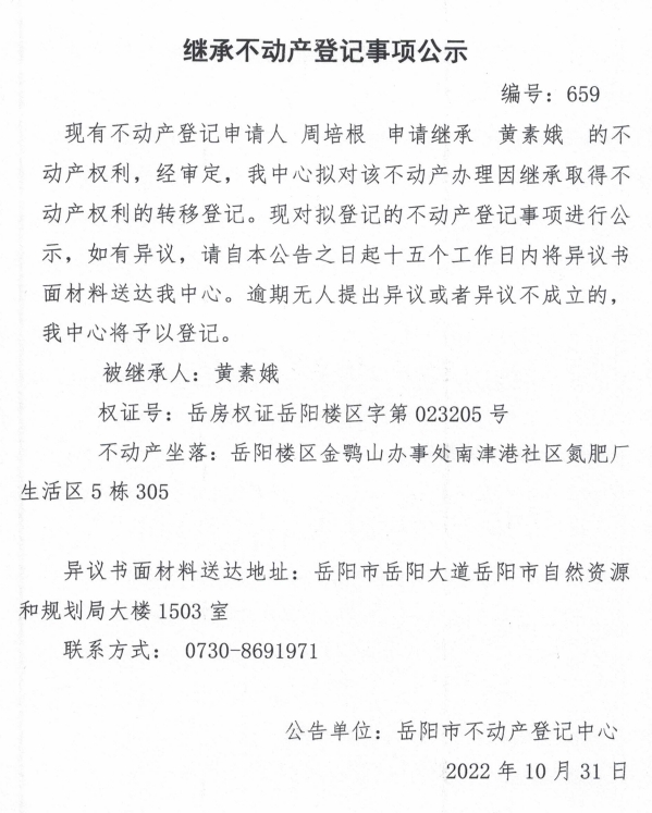 继承不动产登记公示 编号:周培根(659)