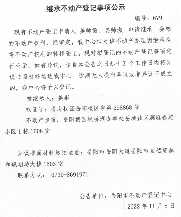 继承不动产登记公示 编号: 姜帅徵、姜帅溦(679)